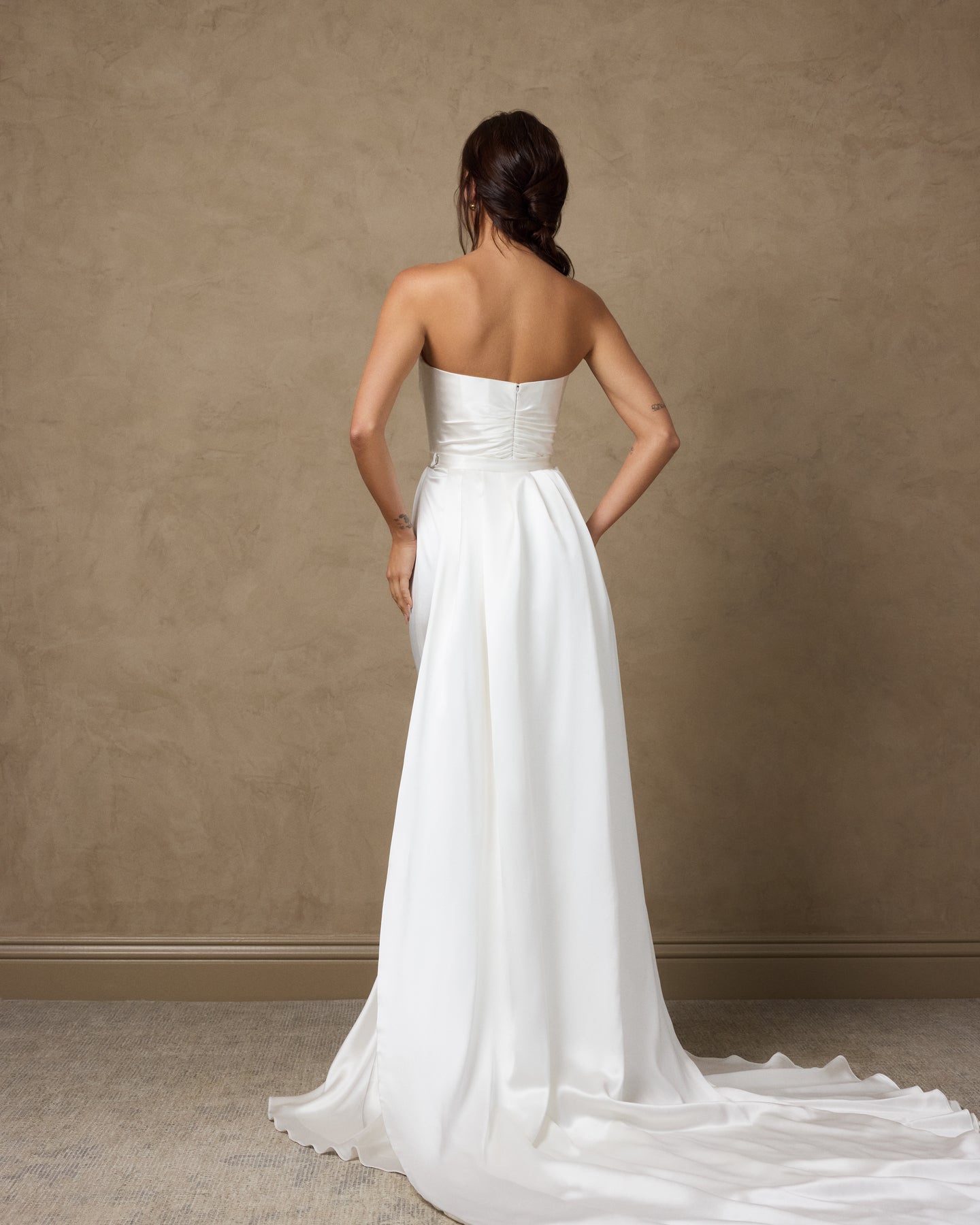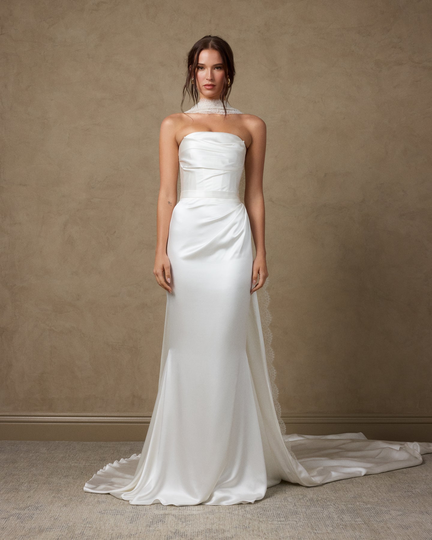 Satin silk crepe gown with a high curved neckline and a delicately hand-draped bodice. Cut on the bias for a fluid silhouette, with our classic interior corset built in for exceptional fit and support. Back invisible zipper closure.