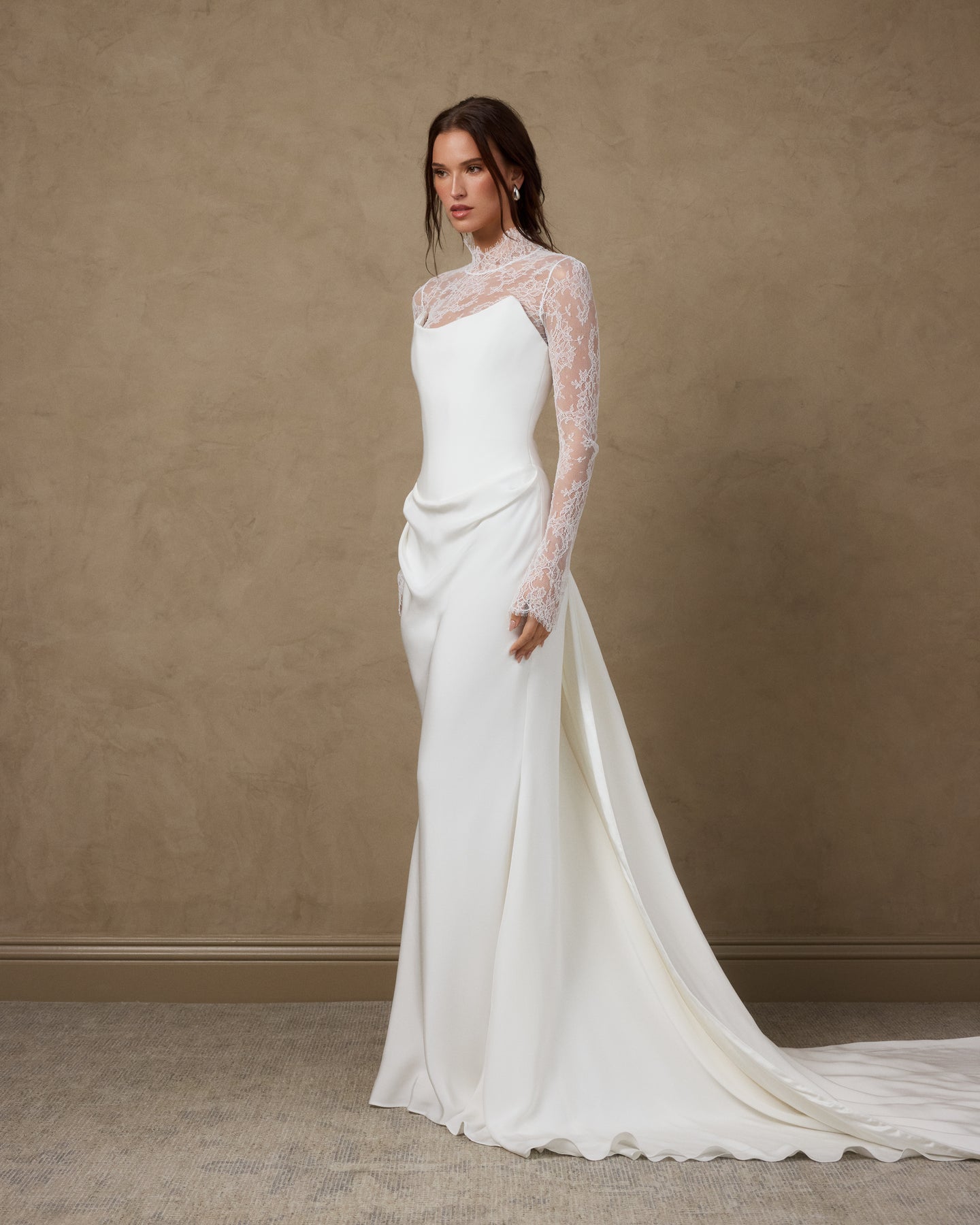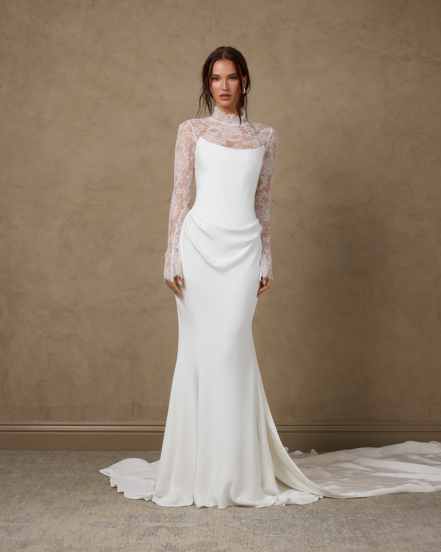 Silk crepe gown with a basque-waist corset and back lacing closure. A slim A-line skirt extends into a full train. Paired here with the Sage lace bodysuit.