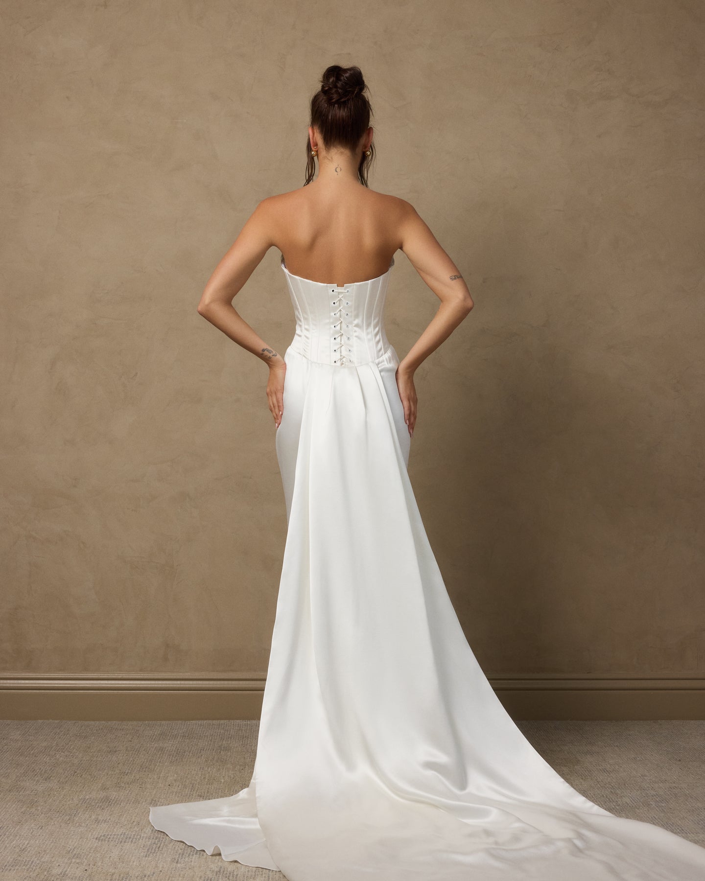 Satin silk crepe gown with a drop-waist corset and back lacing closure. A draped cowl neckline and visible boning highlight the structured bodice. Finished with a slim A-line skirt and an extended train.