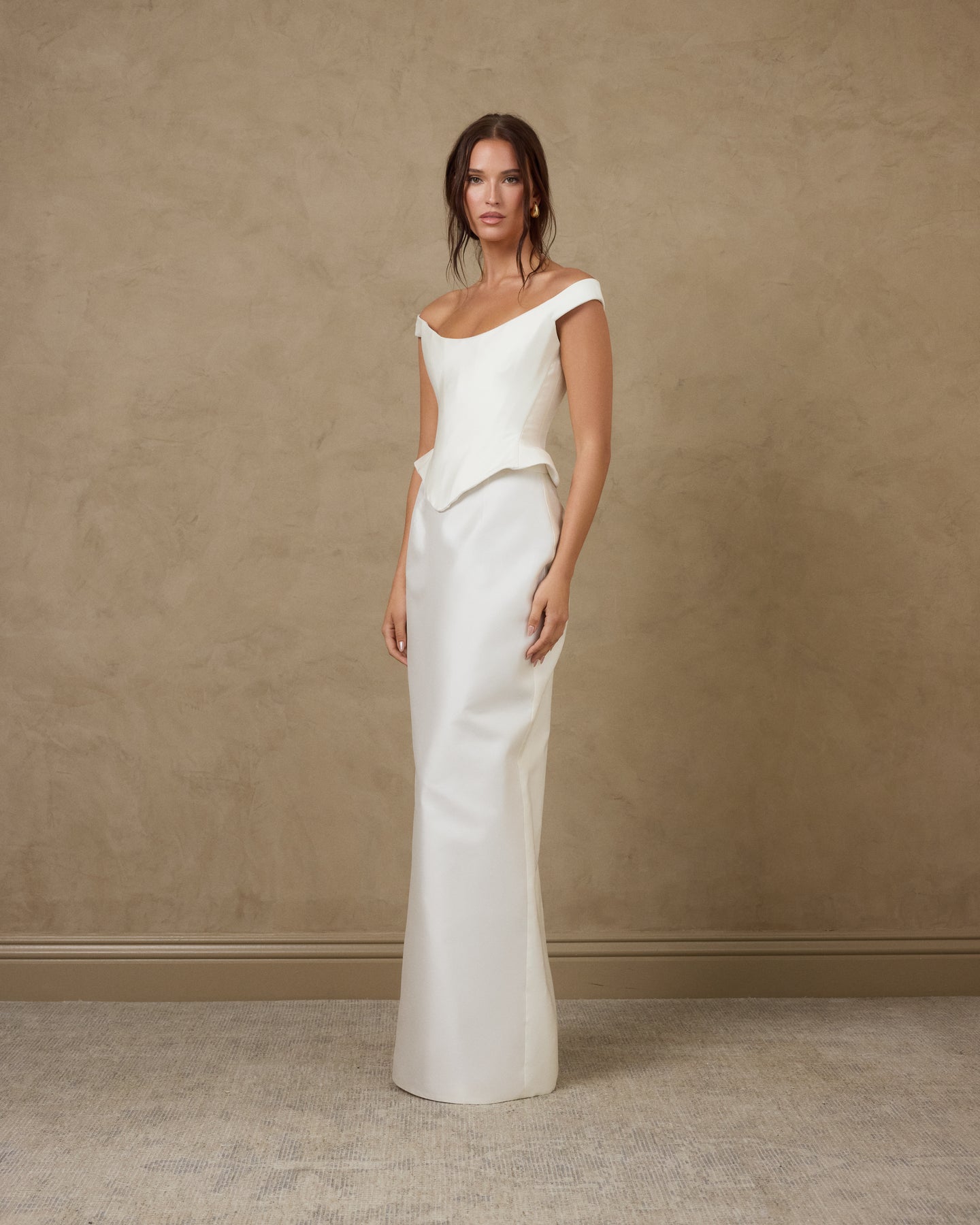 Silk wool mikado corset with a lace-up back closure. Paired with a slim column skirt, with a vent at center back. Designed to function as separates.
