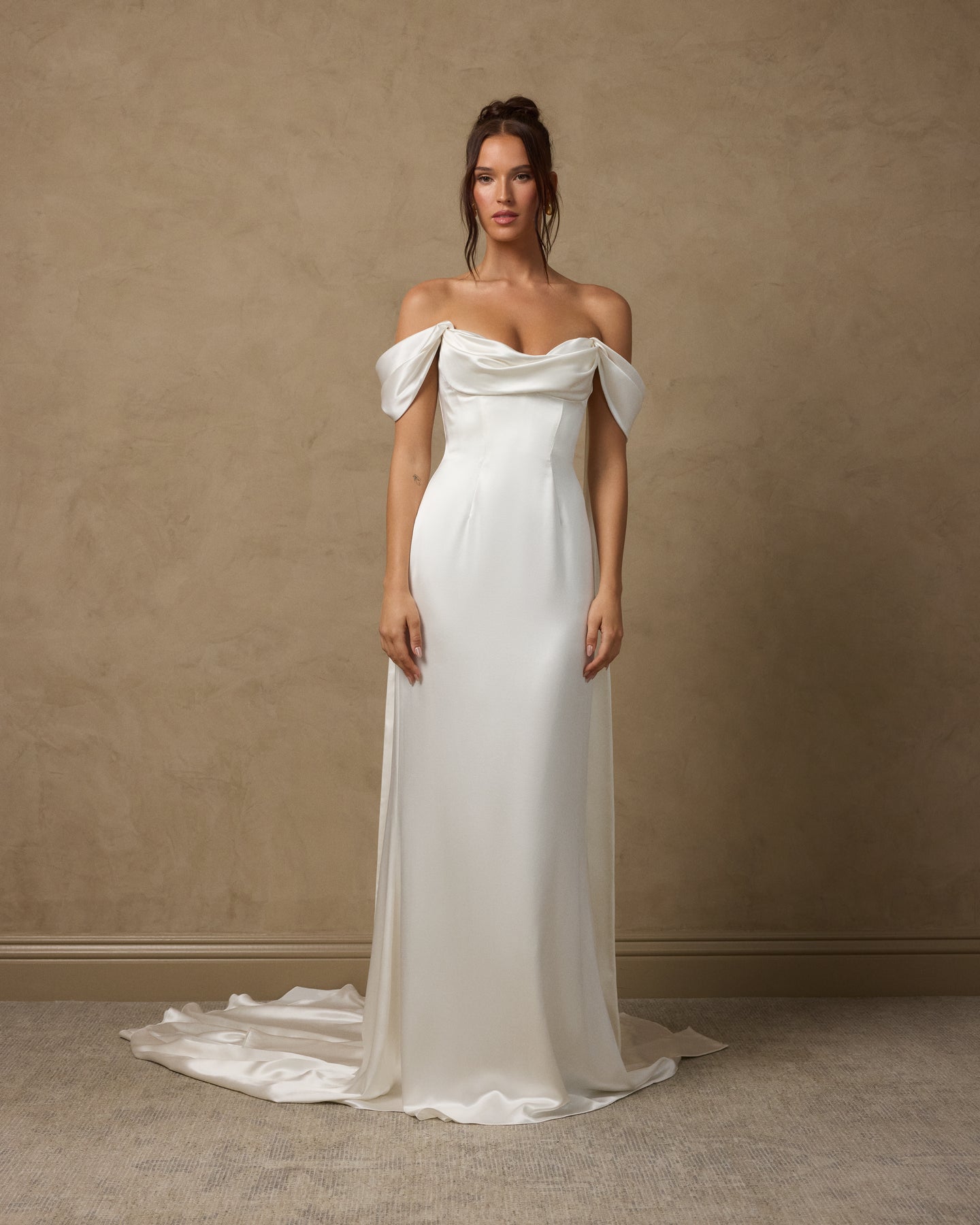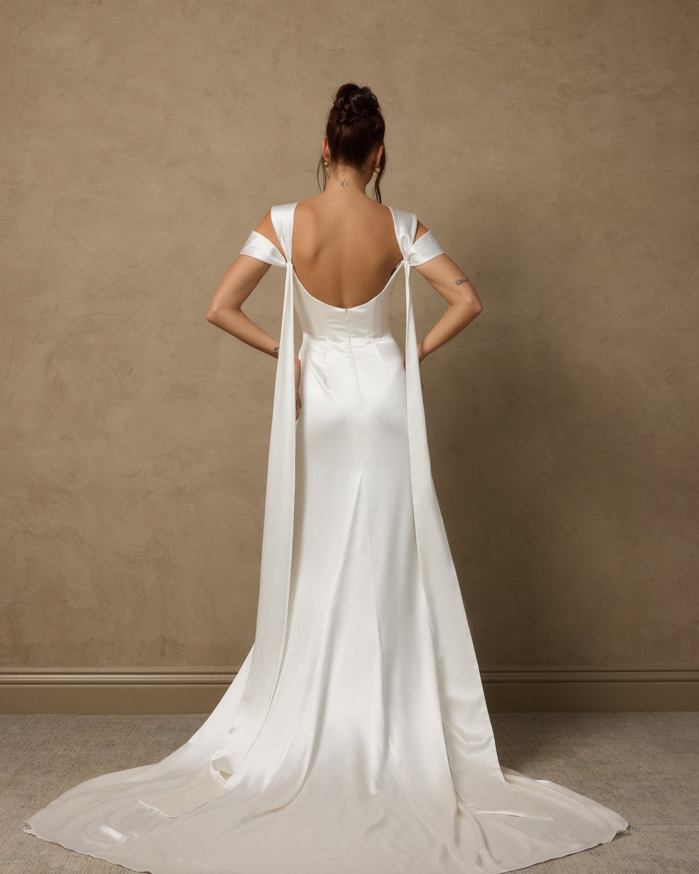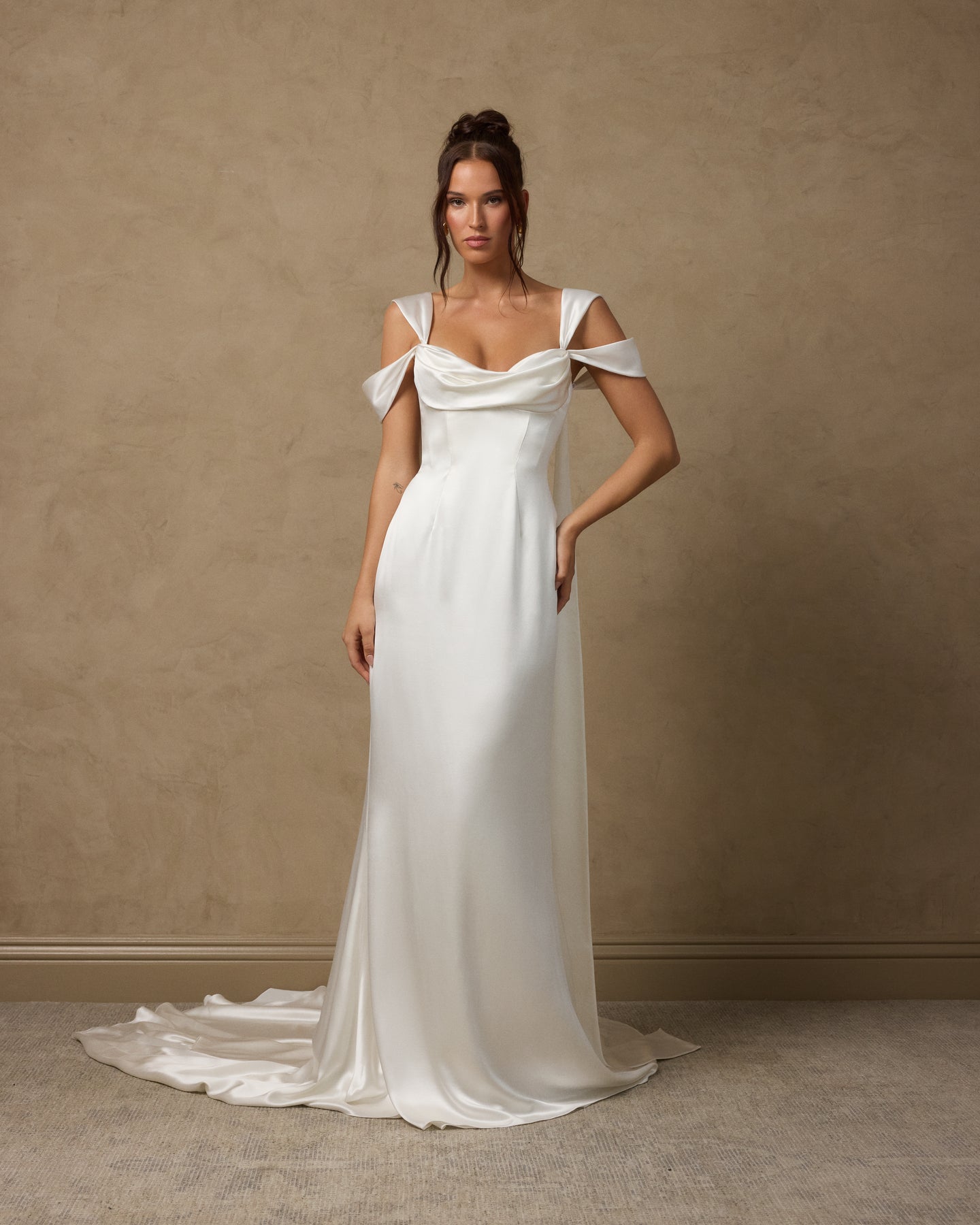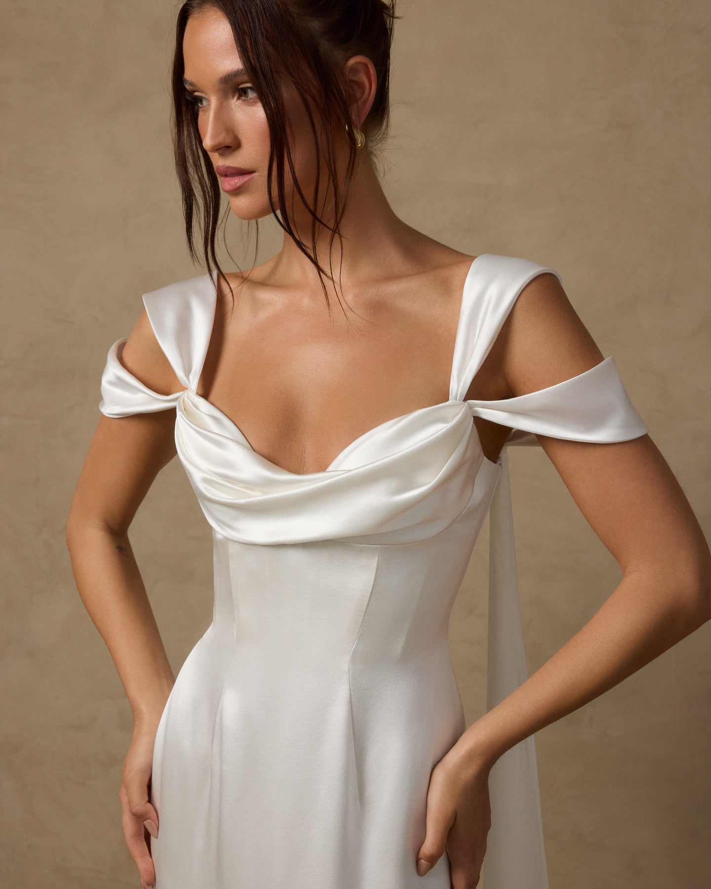 Silk satin crepe gown with a draped front sweetheart neckline and interior corset for support. Features a gentle A-line silhouette and versatile straps that can be styled on or off the shoulder, with streamer detailing cascading down the back. Finished with a center back zipper closure.